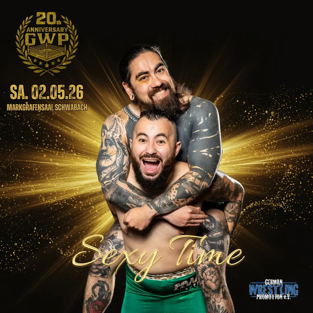 Sexy Time kehren zurück zum großen 20‑jährigen GWP‑Jubiläum. Das Kult‑Tag Team um Feyyaz Aguila und Alex Sixxx, seit Jahren Publikumsmagnet und Garant für Stimmung, wird am 01. und 02. Mai live in Schwabach dabei sein. Mit ihrem unverwechselbaren Mix aus Charme, Comedy und Action bringen sie die Arena zum Beben und feiern gemeinsam mit den Fans zwei Nächte voller Energie und „Sexy Time“-Feeling.