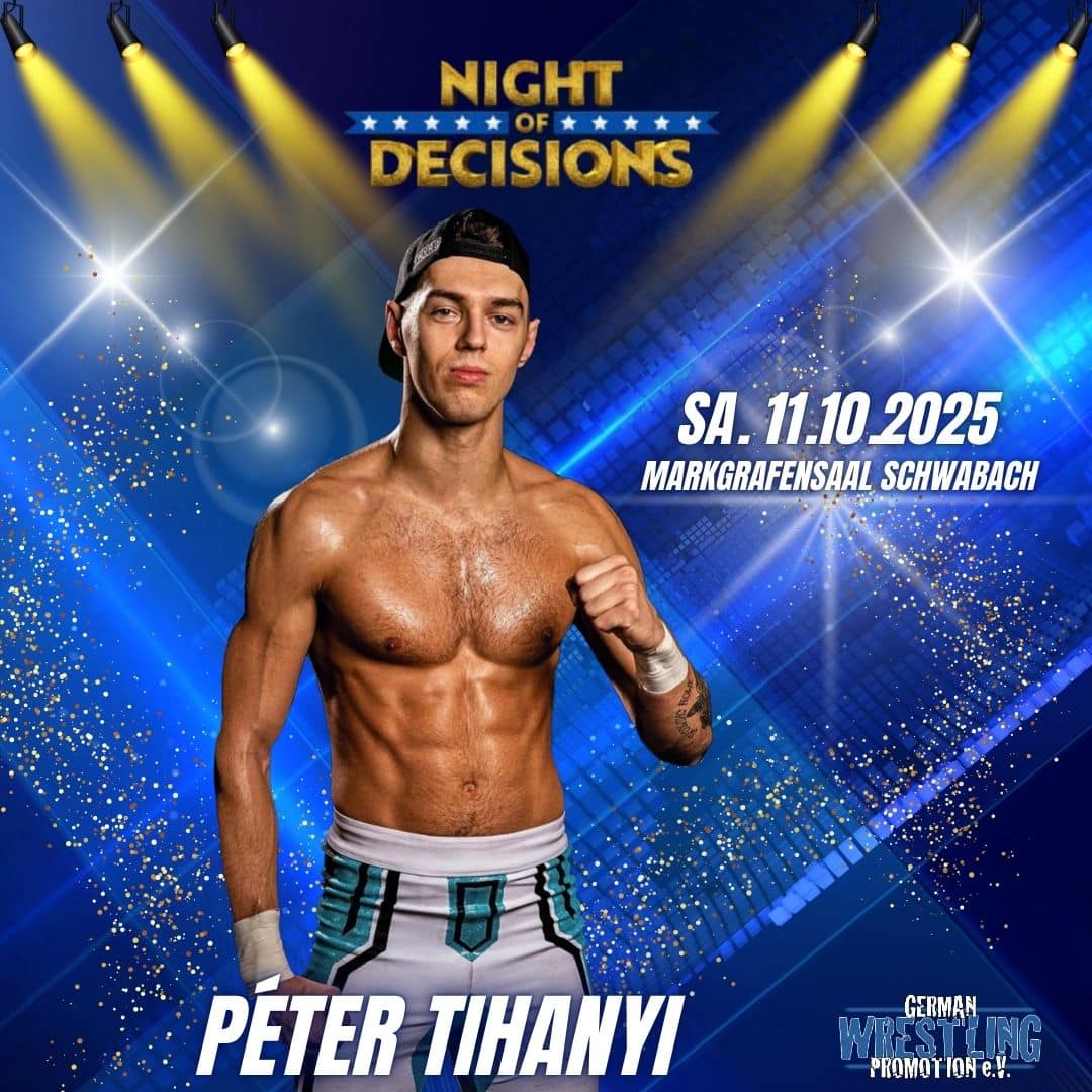 Am 11. Oktober 2025 dürfen sich die Fans bei GWP Night of Decisions im Markgrafensaal auf ein spektakuläres Duell freuen: Fan-Favorit Yuval Goldshmit trifft auf einen der schnellsten und explosivsten Wrestler Europas – Péter Tihanyi.